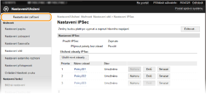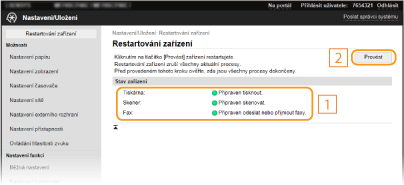 V závislosti na položkách nastavení, které byly změněny, může být nutné aktivovat změny prostřednictvím restartování zařízení. V této části je popsáno, jak stroj restartovat.