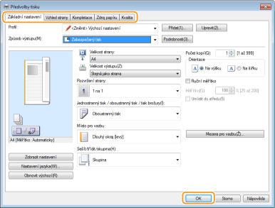 Vyberete ovladač tiskárny pro daný stroj a klikněte na tlačítko [Předvolby] nebo [Vlastnosti].