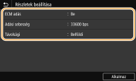 <Funkcióbeállítások> <Küldés> <Faxbeállítások>. Mindazonáltal a <Címjegyzék> adataiból végzett beállítások a Címjegyzékbe bejegyzett rendeltetési helyek részletes beállításaihoz vannak engedélyezve. |