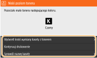 Jeśli komunikat zostaje wyświetlony, gdy urządzenie wykonuje operację odbioru faksu/I-faksu lub skonfigurowano automatyczne drukowanie raportu, odebrane faksy/I-faksy i raporty zostaną zapisane w pamięci urządzenia, aby zachować ich kopię w razie, gdyby ich wydruki wyblakły. Aby kontynuować drukowanie pomimo niskiego poziomu toneru w zasobniku, dla opcji <Kon.dr. Gdy mało ton. w kas.> wybierz ustawienie <Włącz>. <Kon.dr. Gdy mało ton. w kas.>