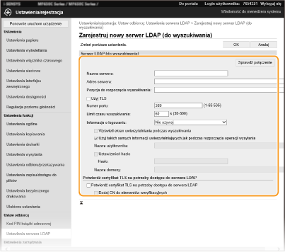 Jeśli w sieci wdrożono serwer LDAP, można wyszukiwać na nim numery faksów oraz adresy e-mail, a następnie określać je jako odbiorców lub rejestrować je w książce adresowej. W przypadki włączenia uwierzytelniania funkcji wysyłania ( Uwierzytelnianie serwera LDAP) należy zarejestrować serwer używany do uwierzytelniania. Do urządzenia można zarejestrować maksymalnie po pięć serwerów LDAP do wyszukiwania i do uwierzytalniania. Do rejestracji serwera LDAP należy użyć Zdalnego interfejsu użytkownika.