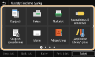 Ekrane Pagrindinis galite pridėti dažnai naudojamų funkcijų, pvz., <Kopijuoti>, <Faksas> ir <Nuskaityti>, nuorodų mygtukus. Pavyzdžiui, galite atlikti užduotis greičiau ir efektyviau, priskirdami parametrų seką (pvz., „Nuskaityti abi originalo puses, išsaugoti labai suspaustame PDF faile ir išsiųsti el. paštu“) vienam mygtukui.