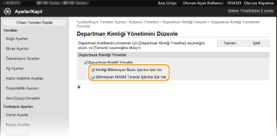 Bilgisayardan Yapılan İşler için Departman Kimliği Yönetimini Etkinleştirme). Ancak bu ayar için onay kutusu seçilmişse, kimlik ve PIN girilmeden de işler yürütülebilir. Doğru departman kimliği ve PIN girilmediği sürece hiçbir işin yürütülmemesi sağlayacak bir ayar yapılandırmak istiyorsanız, onay kutusunu temizleyin.