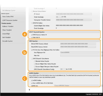 Bonjour tarafından kabul edilen mDNS (çok noktaya yayın DNS), DNS kullanmadan ana bilgisayar adını bir IP adresi ile ilişkilendirme protokolüdür. mDNS'yi etkinleştirmek için onay kutusunu seçin ve [mDNS Adı] metin kutusuna mDNS adını girin. |