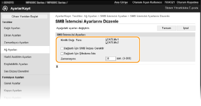 [Bağlantı İçin Şifreleme İste] onay kutusunu seçerseniz makine yalnızca, SMB v3.0 şifreli iletişimi destekleyen SMB sunucularına bağlanabilir. [Belirtilen SMB İstemcisi Sürümleri] için [1.0] ve [2,0] onay kutuları seçildiyse ama [3,0] onay kutusu seçilmediyse makine, SMB v3.0 şifreli iletişimi desteklemeyen SMB sunucularına bağlanamaz.