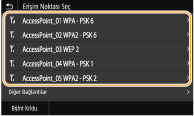 Bağlantı için kullanılabilir kablosuz yönlendiricileri (veya erişim noktalarını) arayabilir ve makinenin ekranından bir tanesini seçebilirsiniz. Ağ anahtarı için şifreleme anahtarını/parolayı girin. Bir kablosuz yönlendirici seçmeden önce SSID ve ağ anahtarı da dahil olmak üzere gerekli kurulum bilgilerini kontrol edip not edin (SSID ve Ağ Anahtarını Kontrol Etme).