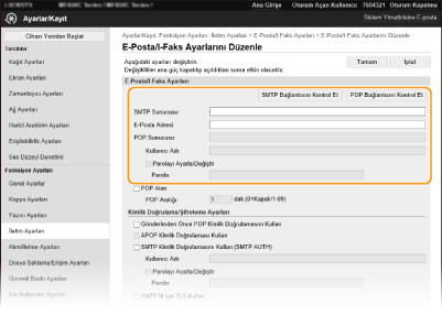 I-Faks göndermek ve almak için makineyi kullanma ayarları ve e-posta ya da I-Faks göndermeden önce iletişimin POP kimlik doğrulama ve şifreleme ayarları gibi ayrıntılı gönderme ve alma ayarlarını yapılandırmak için Uzak Kullanıcı Arabirimini kullanın. Gerekli ayarlar için sağlayıcınız veya ağ yöneticiniz ile iletişime geçin.
