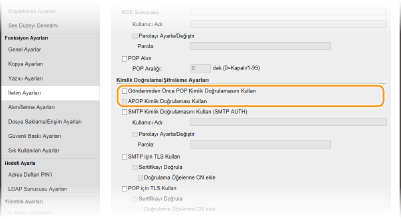 E-posta veya I-Faks göndermeden önce kimlik doğrulaması yapmak üzere POP3 sunucusunu kullanmak için onay kutusunu seçin.