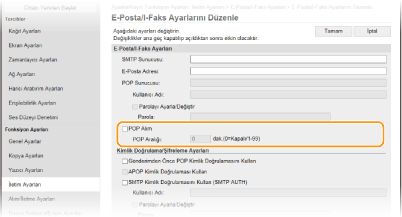 Bu, POP3 sunucusuna otomatik olarak bağlanmak için kullanılan aralığı (dakika olarak) ayarlar. Sunucuda herhangi bir I-Faks belgesi varsa, bunlar otomatik olarak alınır ve yazdırılır.