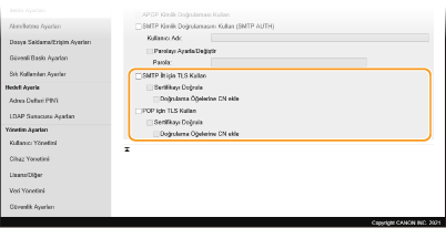 SMTP sunucusu ile iletişim şifrelemesi için TLS'yi kullanmak üzere onay kutusunu seçin. Gereksinimlerinize bağlı olarak [Sertifikayı Doğrula] veya [Doğrulama Öğelerine CN ekle] onay kutusunu seçin.
