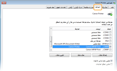 إذا كان [الوصف] الخاص بالمنفذ المحدد هو [Canon MFNP Port]، وكان الجهاز والكمبيوتر على الشبكة الفرعية ذاتها، فسيتم الحفاظ على الاتصال. ولست بحاجة إلى إضافة منفذ جديد. أما إذا كان [Standard TCP/IP Port]، فتلزم إضافة منفذ جديد. ضبط منافذ الطابعة