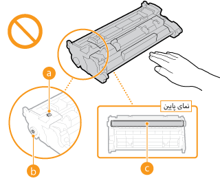 ) یا سطوح تماس الکتریکی ( ) را لمس نکنید. برای جلوگیری از خراشیدگی سطح درام داخل دستگاه یا قرار گرفتن کارتریج تونر در معرض نور، دریچه محافظ درام ( ) را باز نکنید.