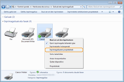 Eskuineko botoiarekin klik egin makina honen kontrolatzailearen ikonoan eta sakatu [Printer properties] edo [Properties].