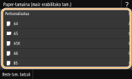 Goian agertzen den pantaila bistaratzen ez bada papera kargatzeanErabilera anitzeko erretiluan beti paper bera kargatzen baduzu, paperaren ezarpen-eragiketak saihesteko aukera duzu paper-tamaina eta mota ezarpen lehenetsi gisa erregistratuz. Ezarpen lehenetsia erregistratzen baduzu, ordea, ez da goiko pantaila bistaratuko. Pantaila bistaratzeko, hautatu <Zehaztu papera kargatzean> (Erabilera anitzeko erretiluarentzako paper-ezarpen lehenetsiak erregistratzea).