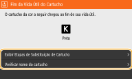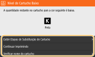 Quando uma mensagem é exibida Ao imprimir, você pode continuar a impressão do original. Se uma mensagem for exibida durante o recebimento de um documento de I-Fax, a máquina não imprime, e assim, a impressão incerta não é realizada. Para continuar a imprimir mesmo se a quantidade restante no cartucho de toner estiver baixa, defina <Continue Imp Qdo Cart Baixo> como <Ativado>. <Continue Imp Qdo Cart Baixo>Especifique quando uma mensagem é exibida |