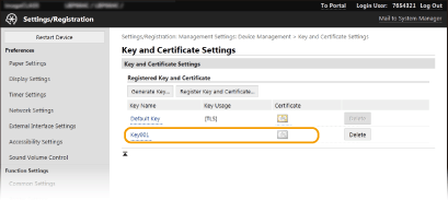A key and certificate cannot be deleted if it is currently used for some purpose, such as when "[TLS]" or "[IEEE 802.1X]" is displayed under [Key Usage]. In this case, disable the function or replace the key and certificate before deleting it.