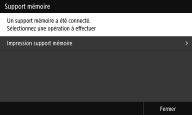 Si l'option <Aff. cont. sup. mém. conn.> est réglée sur <Activé>, les opérations disponibles s'affichent lorsque vous insérez un périphérique mémoire USB alors que l'écran Accueil est affiché. <Aff. cont. sup. mém. conn.> ![]() Comme les écrans ne sont pas toujours affichés en mode Veille, quittez le mode Veille avant d'insérer un périphérique mémoire USB. |
