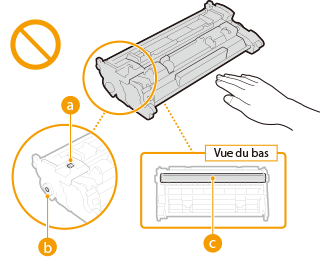 Prenez soin de tenir la cartouche de toner par la poignée. Ne touchez ni la mémoire de la cartouche de toner (  ) ni les contacts électriques (  ). Pour ne pas égratigner la surface du tambour ou l'exposer à la lumière, évitez d'ouvrir le cache de protection du tambour (  ). |