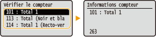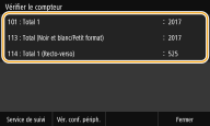 Vous pouvez vérifier le nombre total de pages imprimées par l'appareil. Ces totaux comprennent les rapports imprimés et les impressions réalisées depuis des supports mémoires et depuis des ordinateurs.