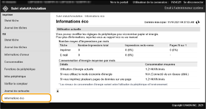 Le volume total mensuel d'impressions et la consommation électrique totale mensuelle sont affichés. Vous pouvez afficher l'écran Informations éco et changer les réglages pour économiser le papier et réduire la consommation électrique.