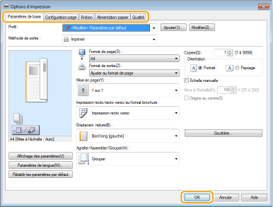 Faites les réglages nécessaires pour l'impression et cliquez sur [OK].