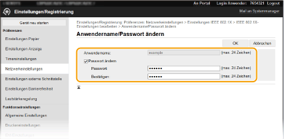 3 | Stellen Sie Anwendername/Passwort ein. [Anwendername] Geben Sie alphanumerische Zeichen für den Anwendernamen ein. [Passwort ändern] Zum Festlegen oder Ändern des Passworts aktivieren Sie das Kontrollkästchen, und geben Sie alphanumerische Zeichen für das neue Passwort in die Textfelder [Passwort] und [Bestätigen] ein. |