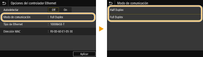 2 | <Modo de comunicación> seleccione el modo de comunicación.![]() <Half Duplex> Envía y recibe datos de comunicación de forma alterna. Seleccione cuándo se conecta el equipo a un dispositivo de red utilizando Half Duplex. <Full Duplex> Envía y recibe datos de comunicación de forma simultánea. Utilice esta opción en la mayoría de los entornos. |