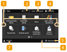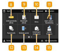 ![]() | <Geheugenmedia afdruk>Druk bestanden af die op een USB-geheugenapparaat zijn opgeslagen. Afdrukken vanaf een USB-geheugenapparaat (afdrukken via geheugenmedia) <Beveiligde afdruk>Met behulp van deze functie drukt u een beveiligd document af. Een document afdrukken dat is beveiligd met een pincode (beveiligd afdrukken) <Menu><Functie-instellingen>, <Voorkeuren>, en vele andere instellingen van het apparaat zijn toegankelijk met deze knop. Overzicht van menuopties <Appl. Library - Handleiding>Geeft een beschrijving van Application Library (Toepassingenbibliotheek). <Papierinstell.>Met deze knop kunt u het formaat en type papier opgeven dat is geladen in de papierlade en multifunctionele invoer. Het type en formaat papier opgeven <Mobiele portal>Breng hiermee een verbinding met een mobiel toestel tot stand. Verbinding maken met mobiele apparaten <Instellingen startscherm>Hiermee kunt u de knoppen op het scherm Start in een andere volgorde weergeven. Het scherm Start aanpassen <Update firmware>Hiermee kunt u de firmware actualiseren via het internet. De Firmware updaten |