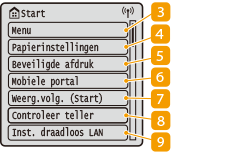 ![]() | <Menu><Functie-instellingen>, <Voorkeuren>, en vele andere instellingen van het apparaat zijn toegankelijk met deze knop. Overzicht van menuopties <Papierinstellingen>Met deze knop kunt u het formaat en type papier opgeven dat is geladen in de papierlade en multifunctionele invoer. Het type en formaat papier opgeven <Beveiligde afdruk>Met behulp van deze functie drukt u een beveiligd document af. Een document afdrukken dat is beveiligd met een pincode (beveiligd afdrukken) <Mobiele portal>Breng hiermee een verbinding met een mobiel toestel tot stand. Verbinding maken met mobiele apparaten <Weerg.volg. (Start)>Hiermee kunt u de knoppen op het scherm Start in een andere volgorde weergeven. Het scherm Start aanpassen <Controleer teller>Geeft het totaale afdrukvolume weer. Aantal afdrukken weergeven <Inst. draadloos LAN>Met behulp van deze knop kiest u de instellingen van het draadloze LAN. Verbinding maken met een draadloos LAN |
