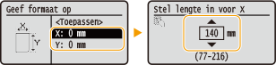 2 | Geef de lengte van de <X>-zijde en <Y>-zijde op. Model aanraakscherm Selecteer <X> of <Y>, en voer de lengte van iedere zijde in met behulp van de numerieke toetsen. Model zwart-wit LCD |