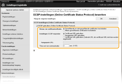 U kunt verifiëren of het certificaat dat u tijdens de communicatie van de andere partij hebt ontvangen geldig is door een verzoek te zenden naar de OCSP (online certificate status protocol) responder (een server die OCSP ondersteunt). Kies het verificatieniveau van het certificaat en de OCSP-responder waarmee u verbinding wilt maken. De beheerder moet deze registreren.