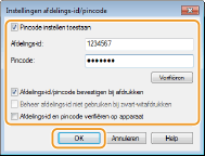 Steeds wanneer u afdrukt of faxt vanaf een computer, moet u het selectievakje voor het weergeven van het uitklapscherm [Afdelings-id/pincode bevestigen] inschakelen.