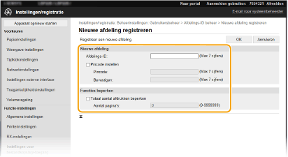 U kunt een Afdelings-ID registreren en hieraan een pincode toewijzen. Registreer alle Afdelings-ID's die moeten worden beheerd.