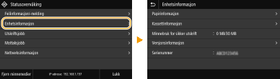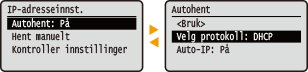 Du kan endre en rekke skjermrelaterte innstillinger, som skjermspråket: <Displayinnstillinger> Du kan endre hvilken skjerm som automatisk vises når maskinen står inaktiv i et angitt tidsrom: <Funksjon etter auto-nullstilling> Du kan endre ulike innstillinger for brukervennligheten, som skjermens lysstyrke: <Tilgjengelighet> |