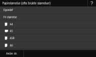 Hvis skjermbildet vist over ikke vises når papir er lagt innHvis du alltid legger i samme papir i flerfunksjonsskuffen, kan du hoppe over innstilling av papir ved å registrere papirformatet og -typen som standardinnstillingen. Når standardinnstillingen er registrert, vises derimot ikke skjermbildet vist over. For å vise skjermbildet, velger du <Angi når papir lastes> (Registrere standard papirinnstillinger for flerfunksjonsskuffen). |