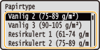 Hvis du ofte må skifte på papiret som skal legges inn, kan du angi <Fri>, dette vil redusere antallet trinn som kreves for å endre innstillingen hver gang. Merk derimot at denne innstillingen lar maskinen skrive ut selv om det er en uoverensstemmelse mellom papirtypeinnstillingen i skriverdriveren og papirtypen som faktisk er lastet inn i maskinen.