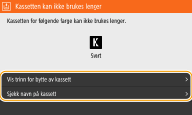 Denne meldingen varsler deg om at en tonerkassett snart må byttes. Sørg for at du har en ny tonerkassett klar. Bytt tonerkassetten hvis denne meldingen vises før du skal skrive ut en stor jobb. Dette vises når <Handling ved varsling> er satt til <Stopp utskrift> (