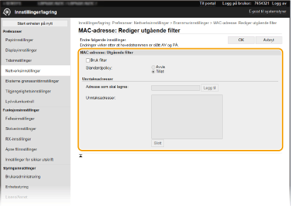 2 | Angi adresseunntak. Angi MAC-adressen i tekstboksen [Adresse som skal lagres], og klikk på [Legg til]. Du trenger ikke skille adressene med bindestreker eller kolon. ![]() Kontroller om det finnes inntastingsfeil Hvis MAC-adresser blir angitt feil, kan det hende at du ikke får tilgang til maskinen fra Fjernkontroll. I så fall må du angi <MAC-adressefilter> til <Av>. <MAC-adressefilter> ![]() Når [Avvis] er valgt for et utgående filter Utgående flerkastings- og kringkastingspakker kan ikke filtreres. Slette en MAC-adresse fra unntak Velg en MAC-adresse, og klikk på [Slett]. ![]() | ||||