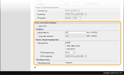 Angi innstillingene for AH/ESP, som leges til i pakker under IPSec-kommunikasjon. AH og ESP kan brukes samtidig. Du kan også velge om du vil aktivere PFS for økt sikkerhet.