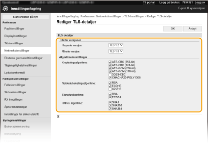 Bruke betjeningspaneletDu kan også aktivere eller deaktivere TLS-kryptert kommunikasjon fra <Meny> på Hjem-skjermen. <Fjernkontroll>/<Bruk fjernkontroll> Starte Fjernkontroll med TLSHvis du prøver å starte Fjernkontroll når TLS er aktivert, kan det hende at det vises et sikkerhetsvarsel om sikkerhetssertifikatet. Hvis dette er tilfelle, må du kontrollere at riktig URL-adresse er angitt i adressefeltet, og deretter fortsette med å vise Fjernkontroll-skjermbildet. Starte grensesnittet for Fjernkontroll Bruke TLS til å kryptere mottak av I-faksHvis POP3-serveren støtter TLS, kan du aktivere TLS for kommunikasjon med POP3-serveren (Konfigurere RX-innstillinger for I-faks). Hvis du vil ha mer informasjon om POP3-serveren, kontakter du Internett-leverandøren eller nettverksadministratoren. |