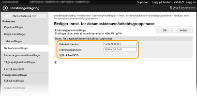 Navnet på arbeidsgruppen er et navn for å gruppere flere datamaskiner slik at grunnleggende nettverkfunksjoner, for eksempel fildeling, blir tilgjengelige på et Windows-nettverk. Skriv inn alfanumeriske tegn for navnet på den arbeidsgruppen som maskinen tilhører.