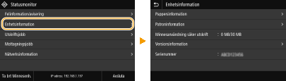 Du kan ändra en mängd skärmrelaterade inställningar, t.ex. vilket språk som ska visas: <Skärminställningar> Du kan ändra den skärm som automatiskt visas när enheten inte har använts under en viss angiven tid: <Funktion eft. autoåterställn.> Du kan ändra olika inställningar för att underlätta användningen av enheten, t.ex. skärmens ljusstyrka: <Hjälpmedel> |