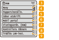 ![]() | <Meny><Funktionsinställn.>, <Preferenser> och många andra inställningar för enheten startas med den här knappen. Inställningsmenylista <Pappersinställn.>Den här knappen används för att ange format och typ för papperet som är påfyllt i papperslådan eller universalfacket. Ange pappersformat och -typ <Säker utskrift>Använd den här funktionen för att skriva ut ett säkert dokument. Skriva ut ett dokument som kräver en PIN-kod (säker utskrift) <Mobil portal>Använd denna knapp för att upprätta en anslutning till en mobil enhet. Ansluta med mobila enheter <Visningsordn. (Hem)>Här kan du ändra i vilken ordning som Hem-skärmknapparna visas. Anpassa skärmen Hem <Kontrollera räknare>Visar totala antalet utskrifter. Visa räknarvärdet <Trådlös LAN-inst.>Använd den här knappen för att ange inställningar för trådlöst LAN. Ansluta till ett trådlöst nätverk |