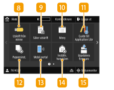 ![]() | <Utskrift från minne>Skriver ut filer som har sparats på ett USB-minne. Skriva ut från ett USB-minne (minnesenhetsutskrift) <Säker utskrift>Använd den här funktionen för att skriva ut ett säkert dokument. Skriva ut ett dokument som kräver en PIN-kod (säker utskrift) <Meny><Funktionsinställningar>, <Preferenser> och många andra inställningar för enheten startas med den här knappen. Inställningsmenylista <Guide till Application Libr>Visar en beskrivning av Application Library (Programbibliotek). <Pappersinst.>Den här knappen används för att ange format och typ för papperet som är påfyllt i papperslådan eller universalfacket. Ange pappersformat och -typ <Mobil portal>Använd denna knapp för att upprätta en anslutning till en mobil enhet. Ansluta med mobila enheter <Inställn. hemskärm>Här kan du ändra i vilken ordning som Hem-skärmknapparna visas. Anpassa skärmen Hem <Uppdatera firmware>Det går att uppdatera firmware via Internet. Uppdatera firmware |