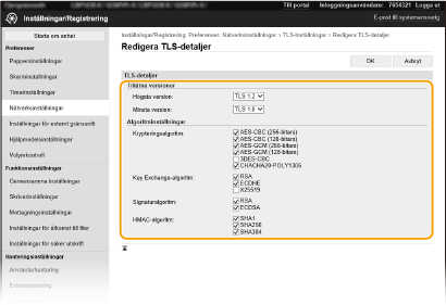Använda kontrollpanelenDu kan även aktivera eller inaktivera TLS-krypterad kommunikation från <Meny> på skärmen Hem. <Fjärranvändargränssnitt>/<Använd fjärrgränssnitt> Starta fjärranvändargränssnittet med TLSOm du försöker starta fjärranvändargränssnittet när TLS har aktiverats kan en säkerhetsvarning visas gällande säkerhetscertifikatet. I så fall kontrollerar du att rätt webbadress har angetts i adressfältet och går sedan vidare för att öppna skärmen för fjärranvändargränssnittet. Starta Fjärranvändargränssnittet Använda TLS för att kryptera mottagning av I-faxOm POP3-servern har stöd för TLS kan du aktivera TLS för kommunikation med POP3-servern (Konfigurera mottagningsinställningar för I-fax). Mer information om POP3-servern kan lämnas av din Internet-leverantör eller nätverksadministratör. |