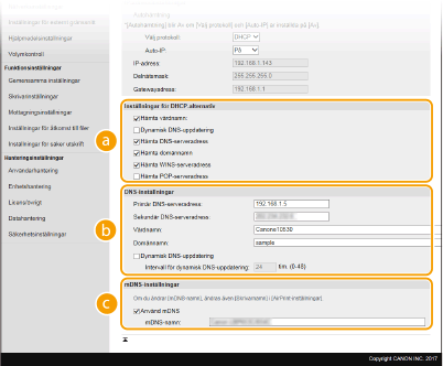 mDNS (multicast-DNS), som antagits av Bonjour, är ett protokoll för att koppla samman ett värdnamn med en IP-adress utan att använda DNS. Om du vill aktivera mDNS markerar du kryssrutan och anger mDNS-namnet i textrutan [mDNS-namn].