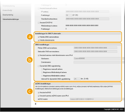 DNS (Domain Name System) har en tjänst för namnmatchning som kopplar samman en värd (eller domän) med en IP-adress. Konfigurera inställningarna för DNS, mDNS eller DHCP efter behov. Åtgärderna för att konfigurera DNS är inte desamma för IPv4 som för IPv6.