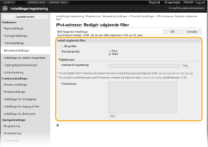 2 | Angiv adresseundtagelser. Indtast IP-adressen (eller IP-adresseområdet) i tekstfeltet [Adresse til registrering], og klik på [Tilføj]. Kontrollér, om der er indtastningsfejl Hvis IP-adresserne er indtastet forkert, kan du muligvis ikke få adgang til maskinen fra Brugerinterface til fjernbetjening. I dette tilfælde skal du angive <IPv4-adressefilter> eller <IPv6-adressefilter> til <Fra>. <IPv4-adressefilter><IPv6-adressefilter>Indtastningsformular for IP-adresser | Beskrivelse | Eksempel | Indtastning af en enkelt adresse | IPv4: Adskil tal med punktummer. | 192.168.0.10 | IPv6: Adskil alfanumeriske tegn med koloner. | fe80::10 | Angivelse af adresseområder | Indsæt en bindestreg mellem adresserne. | 192.168.0.10-192.168.0.20 | Angivelse af adresseområder med et præfiks | Indtast adressen efterfulgt af en skråstreg og et tal, der indikerer præfikslængde. | 192.168.0.32/27