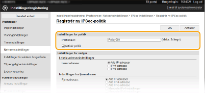 Hvis [Manuelle IPv4-indstillinger] eller [Manuelle IPv6-indstillinger] er valgt for [Fjernadresse], skal du angive IP-adressen for at anvende politikken. Du kan også angive et adresseområde ved at indsætte en bindestreg mellem adresserne.