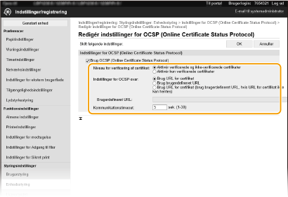 Hvis [Brug brugerdefineret URL] eller [Brug URL for certifikat (brug brugerdefineret URL, hvis URL for certifikat ikke kan hentes)] vælges, skal du indtaste URL-linet for OCSP-respondenten (kun ASCII-kode, maks. 255 tegn).